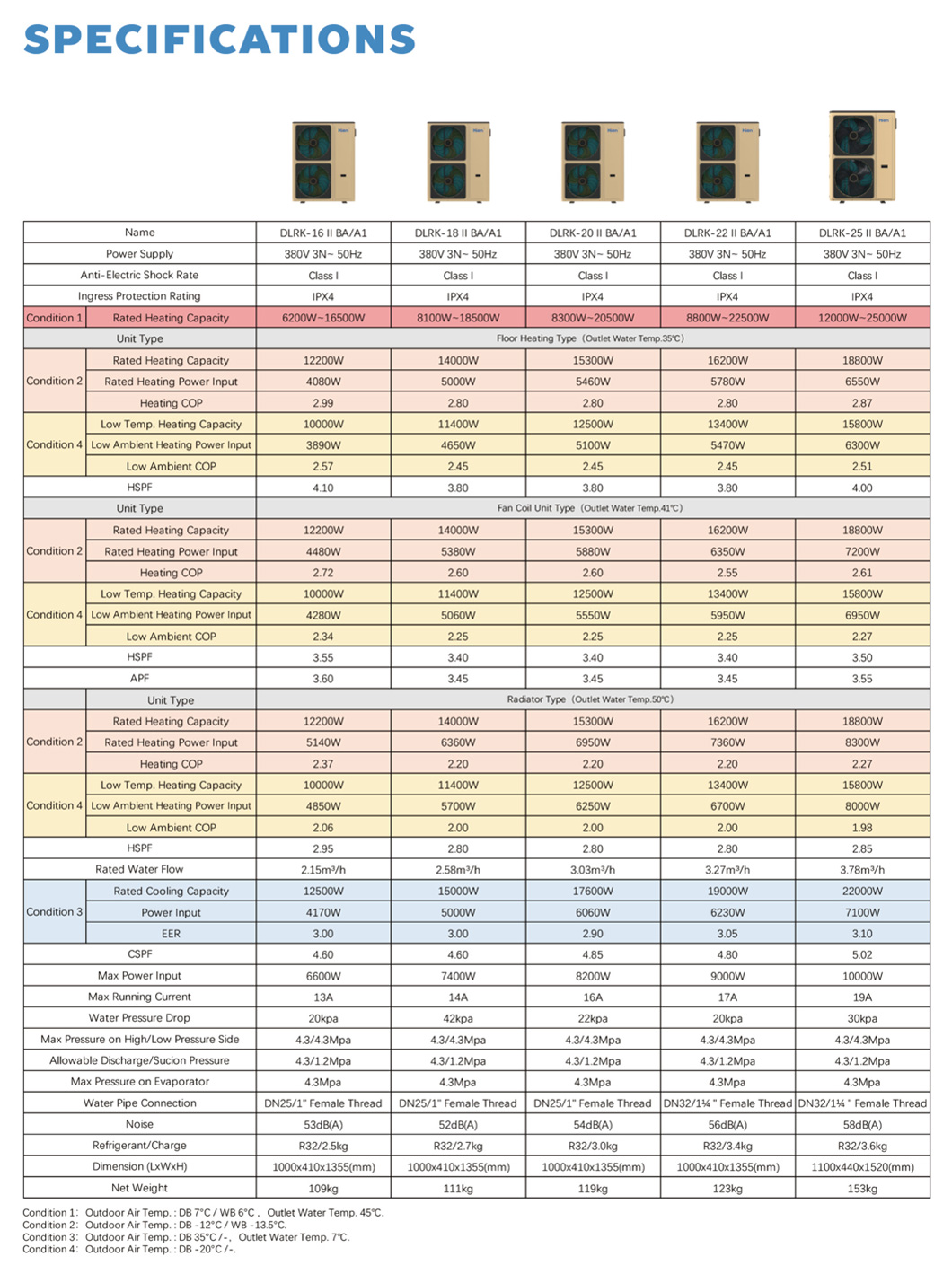 | Condition 1 | Rated Heating Capacity | 12500W~28000W | 13000W~31000W | 13500W~33000W | 15000W~38000W |