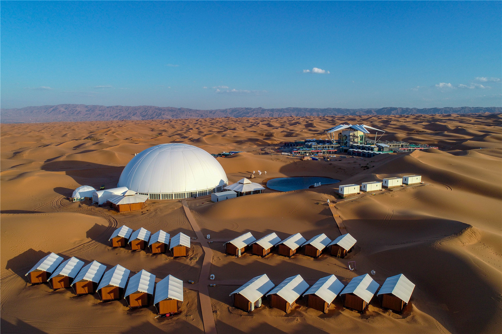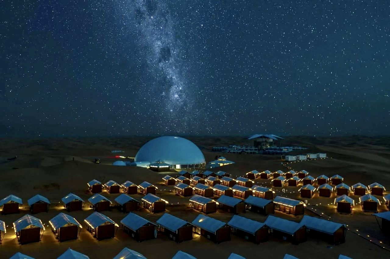 Zhongwei Desert Star River Resort covers a total area of about 30,000 mu, which consists of “Time Treasure Box, Tent Hotel, Amusement Project Area, Sunlight Health Care Area, Exploration and Adventure Area, Children’s Sand Playing Area”, etc. It also owns the first desert library in Ningxia. It is a high-end resort integrating catering and accommodation, conference and exhibition, amusement and health care, adventure travel, desert sports and customized tourism services.